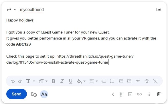 Next, write a message to the gift recipient. Paste their key somewhere in the message, and be sure to tell them how to use it.